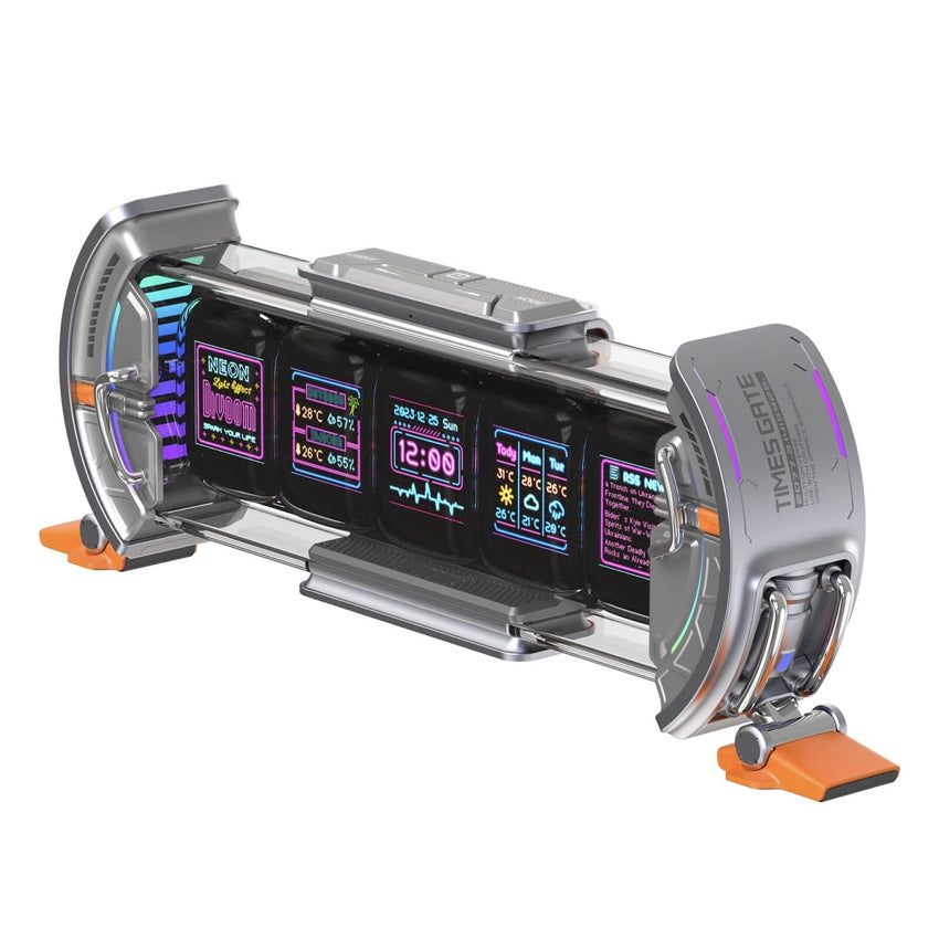 นาฬิกาอัจฉริยะ ที่มาพร้อมกับฟีเจอร์มากมาย เริ่มกันด้วยดีไซน์ที่ไม่ซ้ำใคร ดูทันสมัย เท่ แค่ตั้งโชว์ไว้เฉย ๆ ก็สะดุดตาแล้ว มากับปุ่มการใช้งานทั้งหมด 5 ปุ่ม ด้านบนของนาฬิกา และพอร์ตชาร์จ 1 พอร์ตทางด้านหลัง มีหน้าจอ LCD มาให้ 5 จอด้วยกัน มีไว้สำหรับบอกตัวเลข แถมยังสามารถปรับเพื่อใส่ไฟล์ Gif และรูปภาพได้ บอกก่อนเลยว่าไม่จำเป็นจะต้องเป็นภาพเดียวทั้ง 5 จอ จะตั้งให้เป็นรูปไม่ซ้ำกันทั้ง 5 จอเลยก็ยังทำได้ง่าย ๆ หรือจะปรับให้เป็นการแจ้งเตือนโซเชียลมีเดียและความเคลื่อนไหวทางการเงินก็ปรับแต่งผ่านตัวแอปพลิเคชันของทางแบรนด์ หรือ Divoom App ได้เลยนั่นเอง นอกจากนี้ยังสามารถเปลี่ยนไฟ RGB รอบ ๆ ตัวเรือนได้ภายในแอพเช่นกัน นอกจากใช้ดูเวลาแล้ว ยังมีฟีเจอร์มากมายแบบจัดเต็มมาให้ บอกเลยว่าสายจัดโต๊ะคอมไม่ควรพลาด