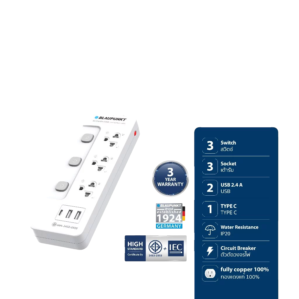 ปลั๊กไฟ Blauponkt Power strip x3 Switch, x3 Socket , x2 USB, x1 Type-C 3M (BP-SP3321)