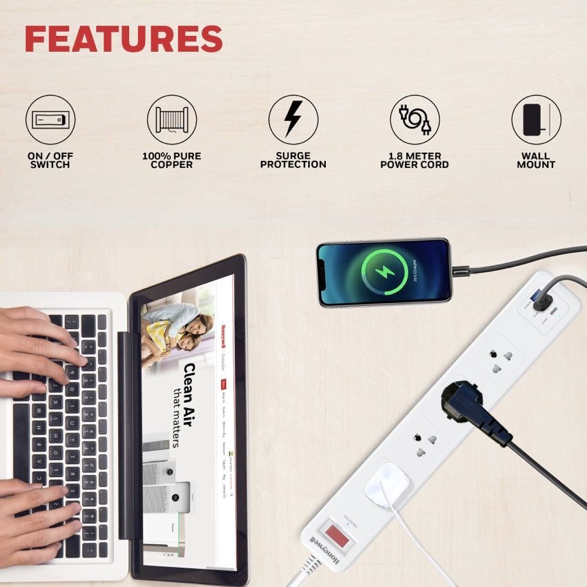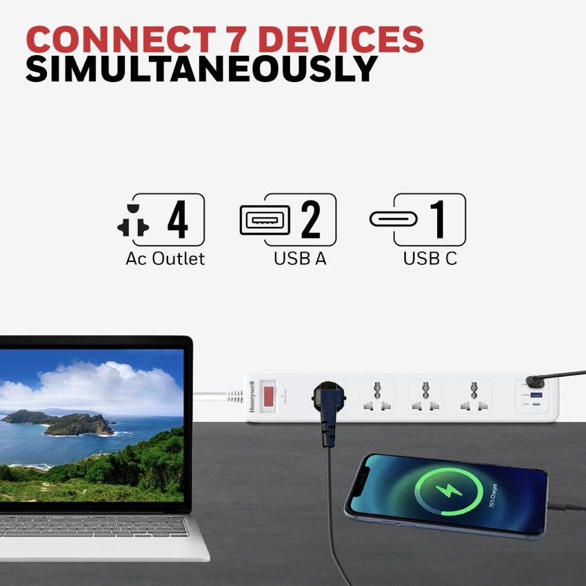 HONEYWELL รางปลั๊กพ่วง 4 ช่อง พร้อม 1 พอร์ต Type-C (PD) และ 2 พอร์ต USB เป็นโซลูชันที่เชื่อถือได้สำหรับการปกป้องอุปกรณ์และการชาร์จที่มีประสิทธิภาพ มาพร้อมสวิตช์หลัก และสามารถใช้เป็นปลั๊กพ่วงหรือปลั๊กป้องกันไฟกระชาก รองรับการเชื่อมต่อได้ถึง 4 ช่อง พร้อมพอร์ต Type-C PD 20W และ 2 พอร์ต USB เพื่อการชาร์จที่รวดเร็วและสะดวกสบาย มอบการป้องกันไฟกระชากสูงสุด 471 จูล