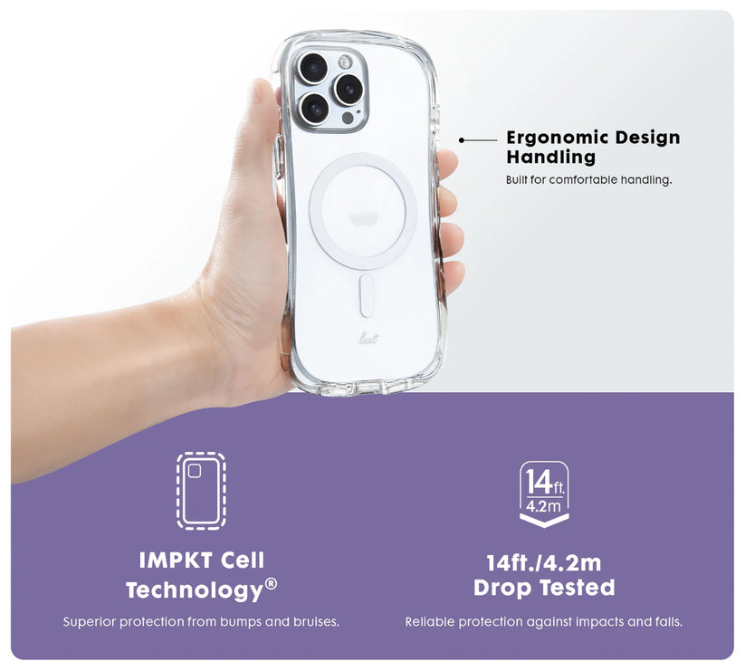 LAUT Pop Lume MagSafe Case สำหรับ iPhone 16 Series โดดเด่นด้วยเคสใสที่โชว์สีตัวเครื่องได้อย่างสวยงาม ขอบข้างผลิตจากเทคโนโลยี IMPKT CELL ที่ออกแบบพิเศษเพื่อรองรับการกระแทกได้ดียิ่งขึ้น ผ่านการทดสอบ Drop Proof สูงถึง 4.2 เมตร รูปร่างเคสถูกออกแบบตามหลักสรีรศาสตร์ ทำให้ถือถนัดมือ และยังคงความบางเบา กระชับ ยกขอบรอบตัวเครื่องเพื่อการปกป้องที่เหนือกว่า รองรับการชาร์จ MagSafe อย่างเต็มรูปแบบ เหมาะสำหรับผู้ที่ต้องการความสวยงามและความทนทานในหนึ่งเดียว