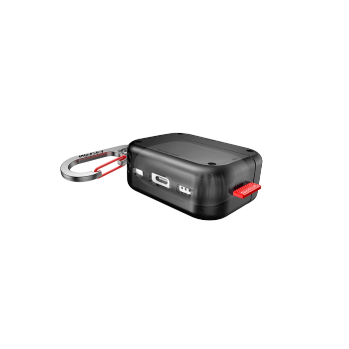 วัสดุเคสเป็นยาง TPU (Thermoplastic Polyurethane) มีความนุ่มนิ่มน่าจับ วัสดุห่วงคล้องเป็นโลหะสังกะสีผสม (Zinc Alloys) ดูแข็งแรง ใช้งานทนทาน การเว้นพอร์ตช่องต่างๆ มีการเว้นช่องเสียบสายชาร์จขนาดพอดี ช่วยให้เสียบชาร์จได้โดยไม่ต้องถอดเคส เว้นช่องช่องสำหรับลำโพงของตัว AirPods Pro 2 ซึ่งก็สามารถใส่กับ AirPods Pro 1 ได้ แต่ตัวเคสไม่ได้เว้นช่องสายคล้องมาให้นะครับ ตัวเคสออกแบบมาให้สามารถแสดงไฟสถานะ LED ของ AirPods Pro 2 บริเวณด้านหลังมีการทำเป็นกรอบบริเวณปุ่มเพื่อบ่งบอกตำแหน่งปุ่มด้านหลังเครื่อง ทำให้สามารถกดปุ่มได้โดยไม่ต้องถอดเคส